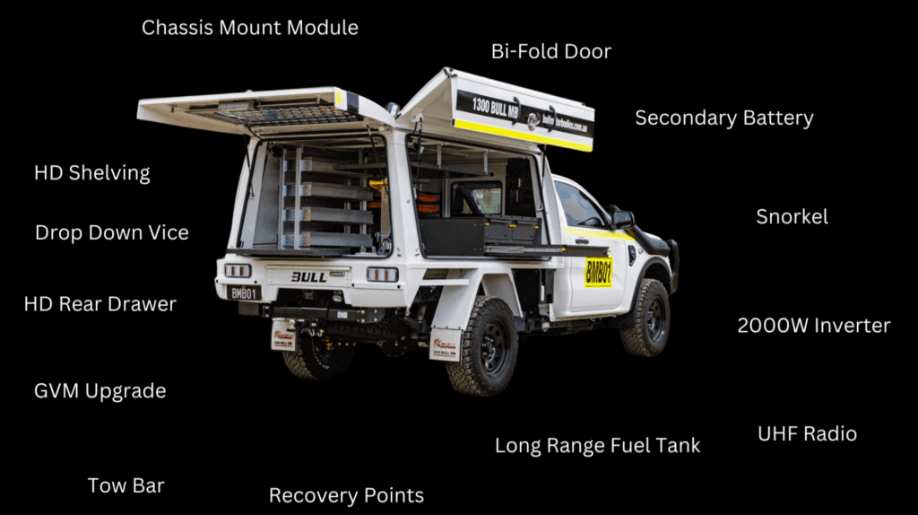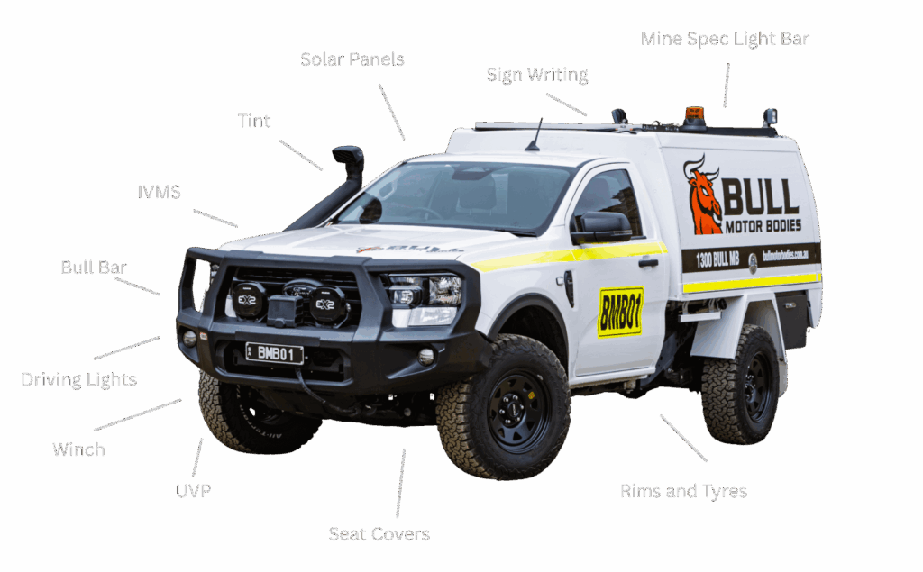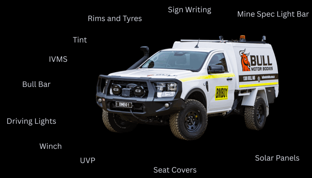 All required vehicle accessories—including GVM upgrades, signage, bull bars, lighting, IVMS, tyres, and more—are reviewed and incorporated into the specification by Bull Motor Bodies. This ensures compliance and consistency across the fleet.